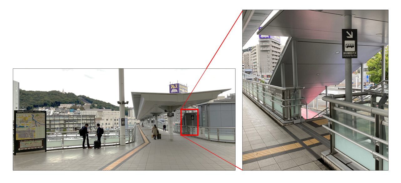 ※広島駅自由通路を出て正面の通路の右手の「貸切観光バス」の案内のある階段を下りてください。